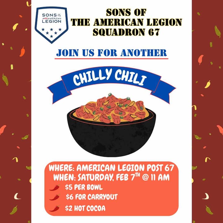 INFO: Call 920-342-2683 for to-go orders! This weekend might be cold, but you can warm up with a bowl of chili at the Lake Mills American Legion Post 67 while supporting a great cause! Proceeds benefit area veterans, and you can enjoy your chili dine-in or to-go. Stop by, warm up, and fuel up!