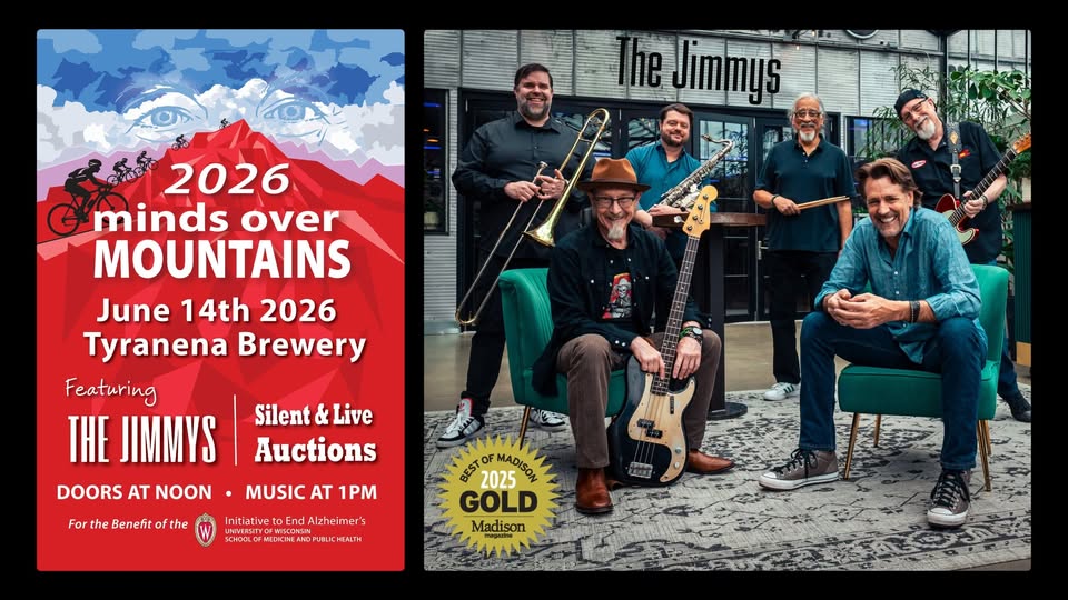 Join us for an afternoon in support of the UW Initiative to End Alzheimer’s featuring music by The Jimmys, silent and live auctions, delish Tyranena brews, and more!Alzheimer’s affects over 6.7 million Americans over 65. The UW Initiative to end Alzheimer’s is at the point of the arrow in early detection, intervention, support and education. Minds Over Mountains is a homegrown fundraising movement to raise awareness and support The Initiative.Known for having everyone in the crowd on their feet, The Jimmys are an award winning, high energy, 6-piece funky blues band with touring experience throughout the US, the Caribbean and Europe. The band is led by seasoned keyboard and Hammond B-3 player Jimmy Voegeli. He is joined by Perry Weber on guitar and vocals, Chris Sandoval on drums, John Wartenweiler on bass and a horn section featuring Pete Ross on sax and Joe Goltz on trombone.“The Jimmys are excellent musicians, wildly fun entertainers and perform a slew of strong, original songs. They’re a treat for any fans of roots rock, old school R&B and straight-up blues. And every performance is like a party!” –Bruce Iglauer, Alligator Records