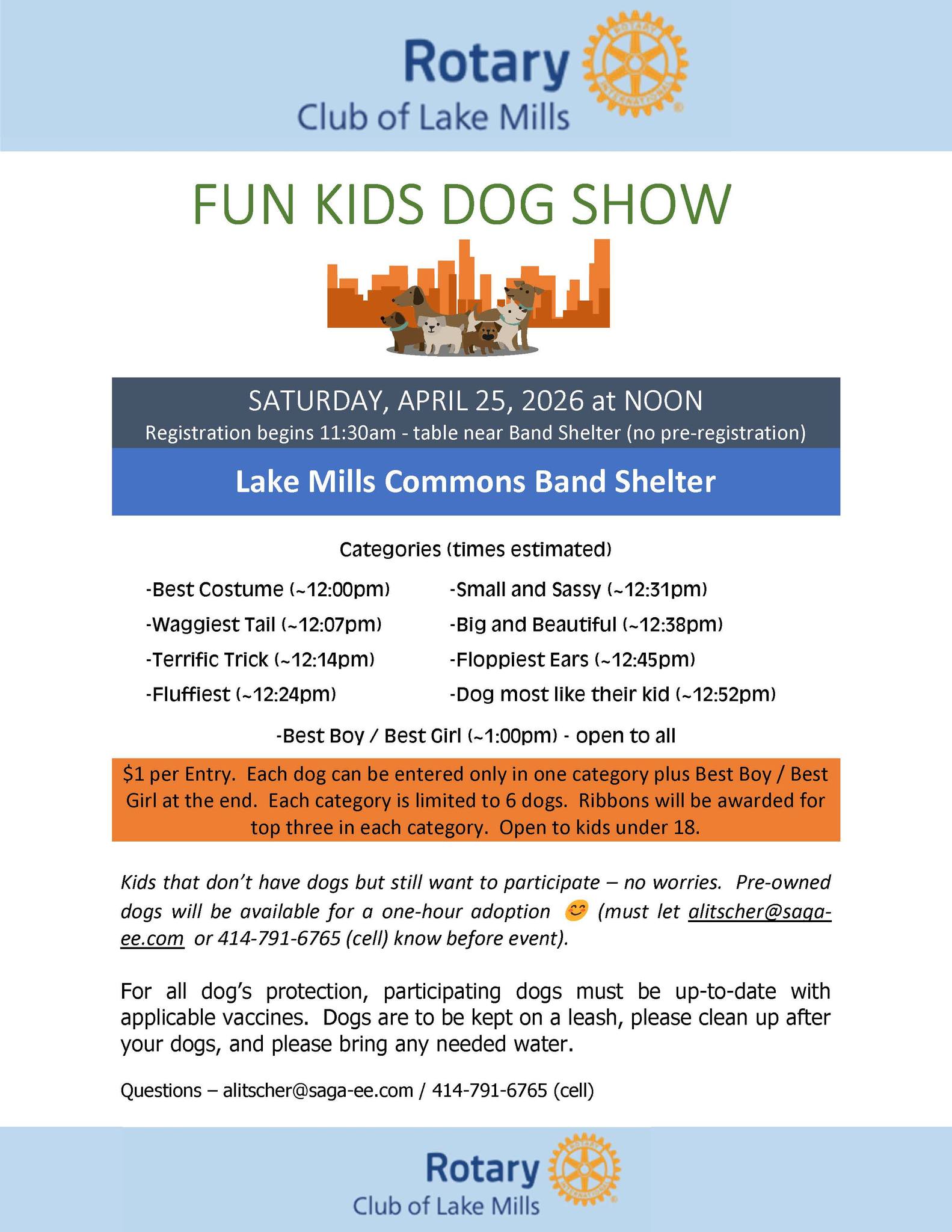 Fun Kids Dog Show – Rotary Club of Lake Mills by Rotary Club of Lake Mills 51 51 people viewed this event. Register for event Date And Time 2026-04-25 @ 12:00 PM to 2026-04-25 @ 02:00 PM Location Commons Park 100 N Main Street Lake Mills, WI 53551 Event Types Community Event Event Category Events Share With Friends Facebook Twitter Linkedin Xing Pinterest